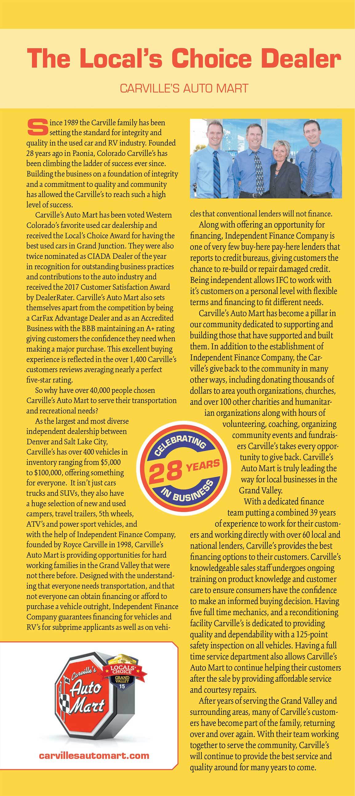 We are a locally owned, family operated, dealership that has been a part of the community in the Grand Valley happily serving Western Colorado for over 28 years. We provide Western Colorado with a fun and memorable purchasing experience along with the best quality, service and selection. When you come to Carville's Auto Mart in Grand Junction, you will always get the best service from the friendliest staff in the valley. We want you to feel right at home as you are browsing through our inventory. Whether you're from Montrose, Ridgeway, Delta, or coming down the Valley from Aspen, Glenwood Springs and Rifle, or right here in Grand Junction, with the largest selection in Western Colorado we know you will find that perfect vehicle, and we will be there helping you every step of the way.