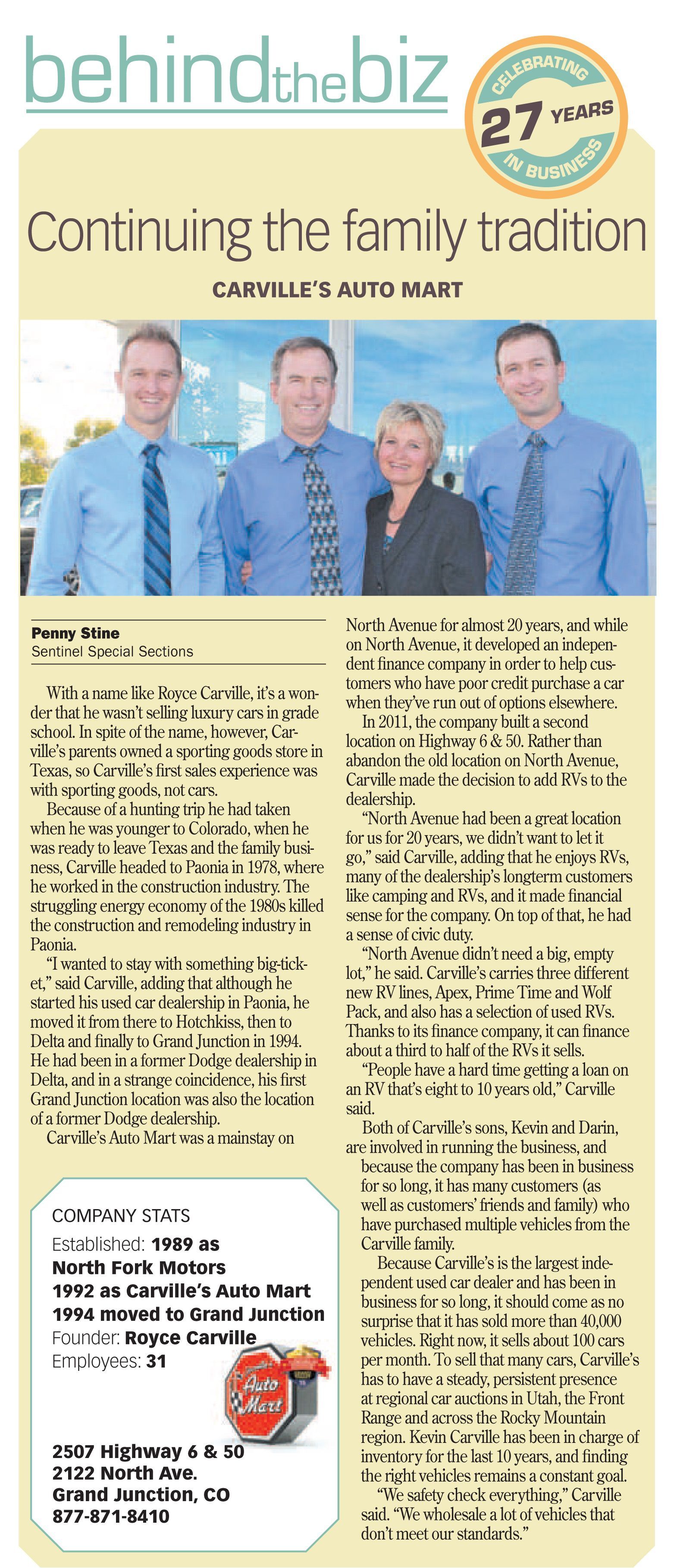 Starting in the small town of Paonia, Co. back in 1989 as North Fork Motors the Carville Family have built Carville's Auto Mart to be the Largest Independently Owned Auto and RV Dealership in Western Colorado. The incredible success was built on a reputation of a "Dealership with a Difference" providing the best quality, service and selection while giving the customer a memorable purchasing experience. Customer Satisfaction is the number one goal and we would like to thank each and every one of those customers who have helped make Carville's Auto Mart such a huge success.